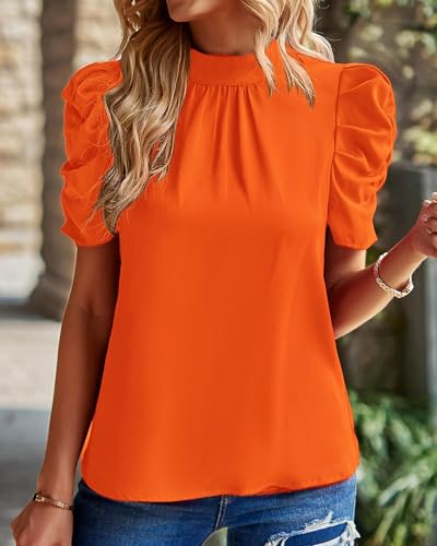BTFBM Womens Tops Dressy Casual Mock Neck Puff Short Sleeve Shirts Back Tie Business Work Blouses Summer Fall 2025