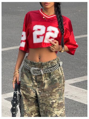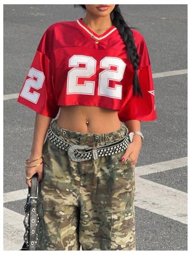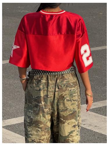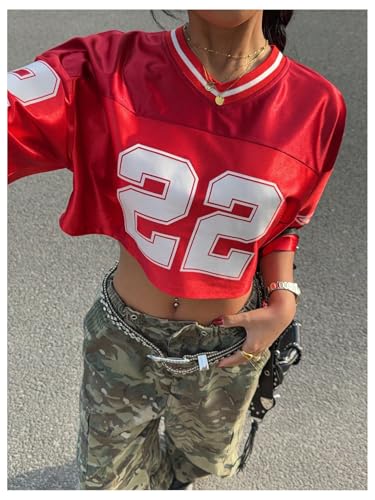 WDIRARA Women's Jersey Shirts Number Graphic Short Sleeve V Neck Tee Loose Crop Top