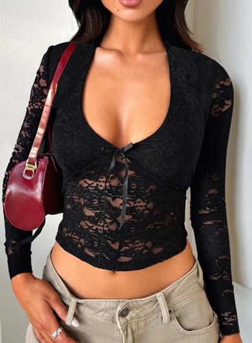 - Design: Boasts a stylish deep v neck and intricate lace detailing; bow tie design; featuring a semi-sheer design with a flattering silhouette; Ideal for layering; this womens tops combines elegance and modern style