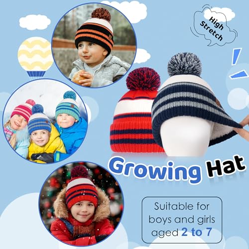 - Stylish and Adorable: The eye-catching striped design and bold blue/white, red/pink or black/orange combinations make this beanie with pom be a standout accessory! The cheerful and fashionable striped patterns are both fun and can enhance the visibility of outdoor adventures. Featuring a big plush ball that attracts kid's love for the vibrant design. These are perfect and cute winter hats, it add a playful and modern touch to children's appearance.